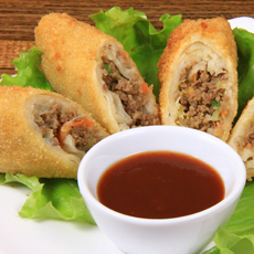 Crocante rolinho primavera de carne bovina e legumes, servido com molho agridoce