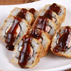 Sushi de salmão, recheado com cream cheese e coberto com molho tarê.