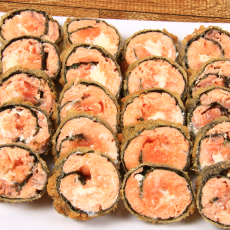 sushi empanado de salmão, kani, cream cheese e pepino, envolto por salmão maçaricado