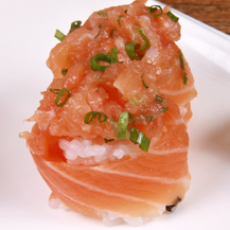 Arroz enrolado com salmão, coberto com salmão batido e cebolinha.