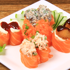 Arroz enrolado com salmão grelhado coberto com salmão batido, cream cheese e cebolinha.